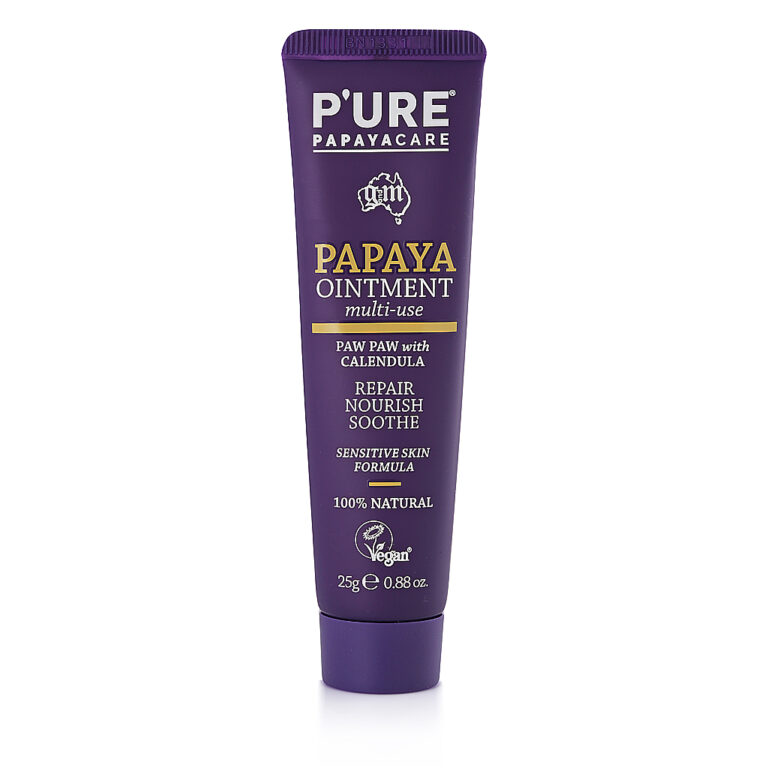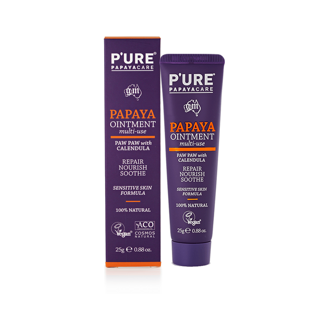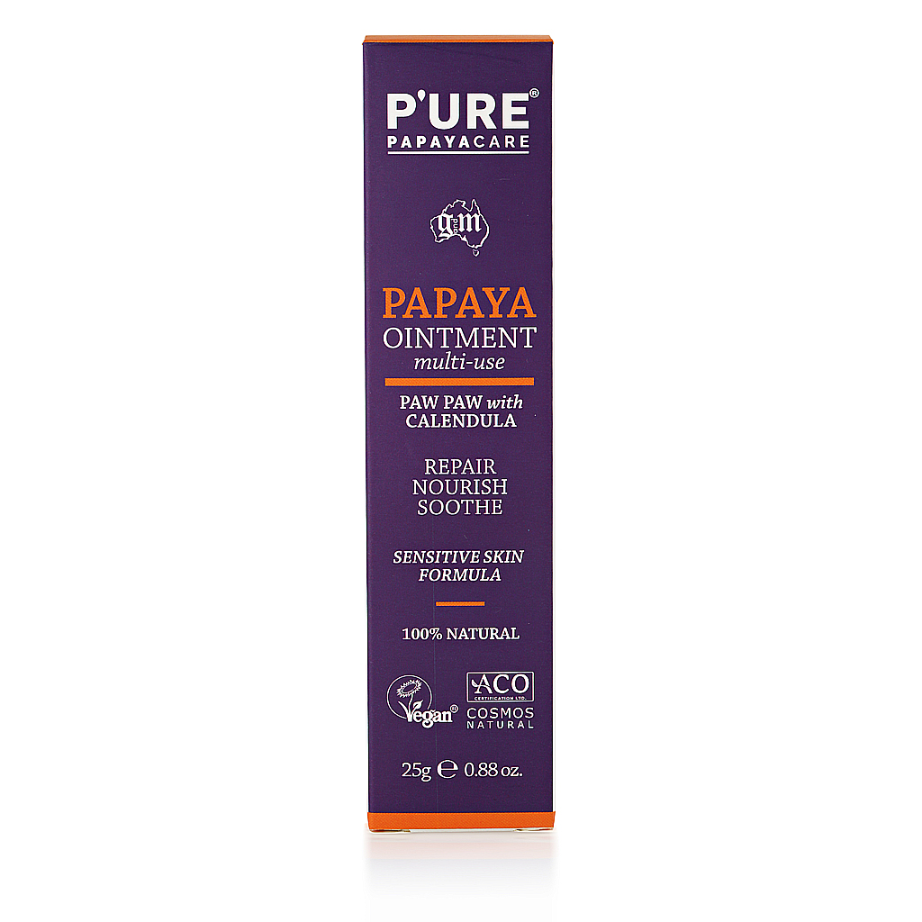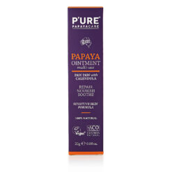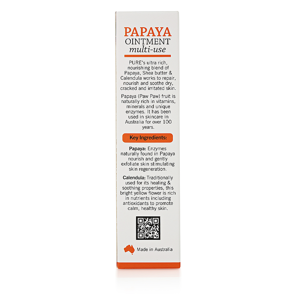 Kem dưỡng da P’URE Papayacare Papaya Ointment chứa hỗn hợp giàu dưỡng chất từ đu đủ, bơ hạt mỡ và cúc vạn thọ, cung cấp dưỡng chất tức thì, phục hồi và làm dịu da và môi khô, nứt nẻ và bị kích ứng. Sản phẩm không chứa dầu khoáng, paraben, sulfat, màu nhân tạo và hương liệu.