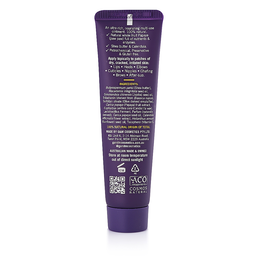 Loại kem dưỡng đa năng này cực kỳ giàu dưỡng chất, giúp làm dịu, phục hồi và bảo vệ làn da một cách tự nhiên. Kem dưỡng đu đủ nguyên chất giúp giữ cho làn da luôn ở trạng thái tốt nhất, khỏe mạnh và cân bằng. Một tuýp, nhiều công dụng – môi, gót chân, khuỷu tay, móng tay, núm vú, vùng da bị cọ xát, lông mày, sau khi tiếp xúc với ánh nắng mặt trời. Được khuyên dùng cho da và môi khô, nứt nẻ và bị kích ứng. Phù hợp cho mẹ và bé, và sau khi điều trị bằng laser.