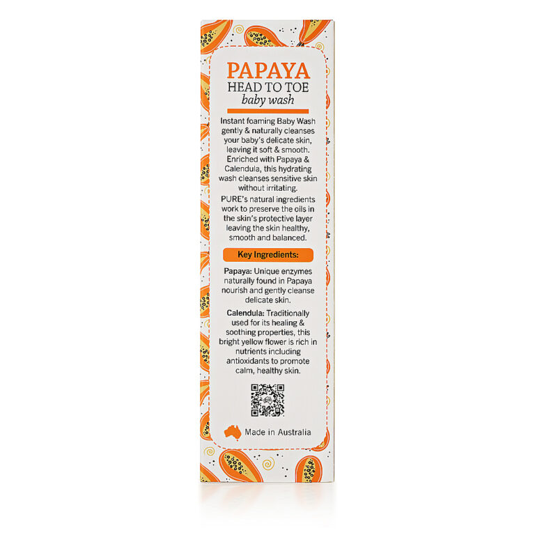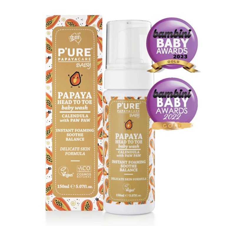 Sữa tắm cho bé P’URE Papayacare Papaya Baby Wash tạo bọt tức thì, nhẹ nhàng và tự nhiên làm sạch làn da mỏng manh của bé, giúp da mềm mại và mịn màng. Được làm giàu với chiết xuất đu đủ và cúc vạn thọ, sữa tắm dưỡng ẩm này làm sạch làn da nhạy cảm mà không gây kích ứng. Sữa tắm Papaya Head to Toe Baby Wash đã giành giải Bạc hạng mục “Sữa tắm tạo bọt tốt nhất cho bé” tại Giải thưởng Bambini Baby Awards 2021.